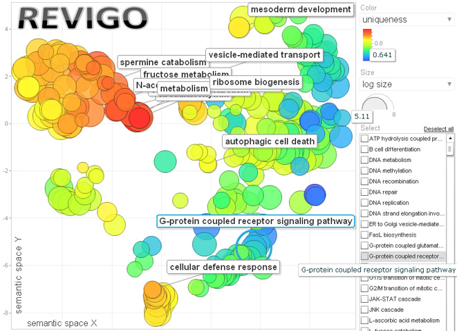 REViGO is a free web server by Supek et al. ("REVIGO summarizes and visualizes long lists of Gene Ontology terms", PLoS ONE 2011), that can take long lists of Gene Ontology terms and summarize them by removing redundant GO terms. The remaining terms can be visualized in semantic similarity-based scatterplots, interactive graphs, or tag clouds. The CateGOrizer is now bundled with Revigo for the convenience of users to take CateGOrizer outputs directly to Revigo for a semantic representative subset analysis. Here is an example of its output: