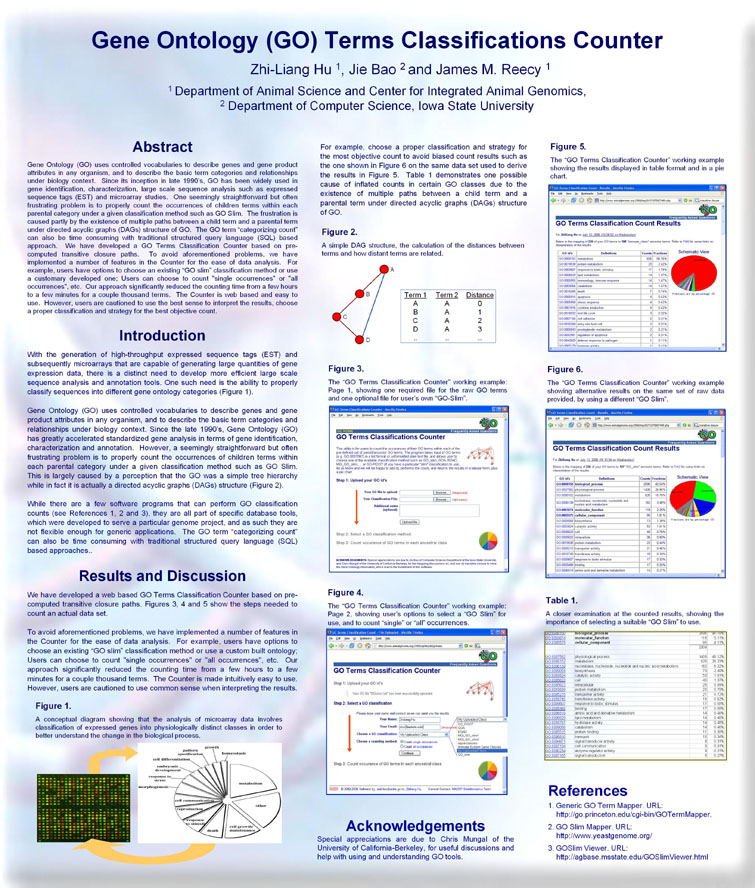 3. Hu, Zhi-Liang, Jie Bao and James M. Reecy (2007). A Gene Ontology (GO) Terms Classifications Counter. Plant & Animal Genome XV Conference, San Diego, CA, January 13-17, 2007.