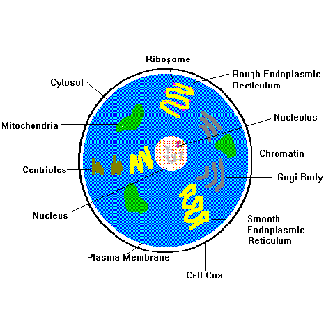 All living organisms are made up of cells. A cell could live on its own if it had the proper environment. Some cells, such as bacteria, actually do live on their own. A cell is made up of many components, and plays a major role in protein synthesis. Cells are continually dividing to help replace damaged or dying cells. An example of a cell is given. Each component (organelle) is labeled. The one organelle to focus on is the nucleus.
