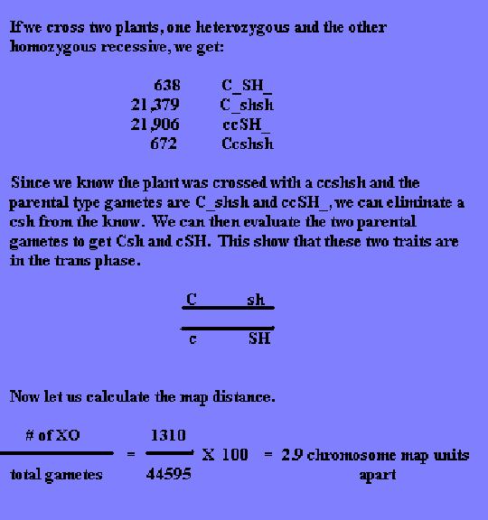 To determine if crossing over exists, it is best to cross a heterozygous plant to a homozygous recessive plant. Then once can calculate the possible gametes from the heterozygous parent. Remember, the larger numbers of the results will show the parental genotypes.