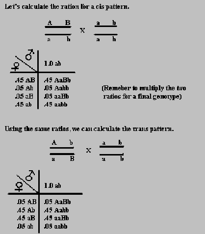 If we know the map units between two traits, we can figure out the outcome of a cross of a heterozygous individual to a homozygous recessive. If two traits are 10 map units apart, we know that this also can be placed as a percent and represent the amount of crossovers occurring. Since there are two possible crossover gametes that occur 10% of the time, we can divide .10 by 2 to get .05 of a chance per crossover gamete. To figure the parental occurrence, we know that 100 - 10 = 90% occurrence, and that there are two possible gametes, so we get a .45 chance for each.