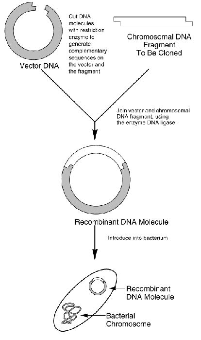 By fragmenting DNA of any origin (human, animal, or plant) and inserting it in the DNA of rapidly reproducing foreign cells, billions of copies of a single gene or DNA segment can be produced in a very short time. DNA to be cloned is inserted into a plasmid (a small, self- replicating circular molecule of DNA) that is separate from chromosomal DNA. When the recombinant plasmid is introduced into bacteria, the newly inserted segment will be replicated along with the rest of the plasmid.