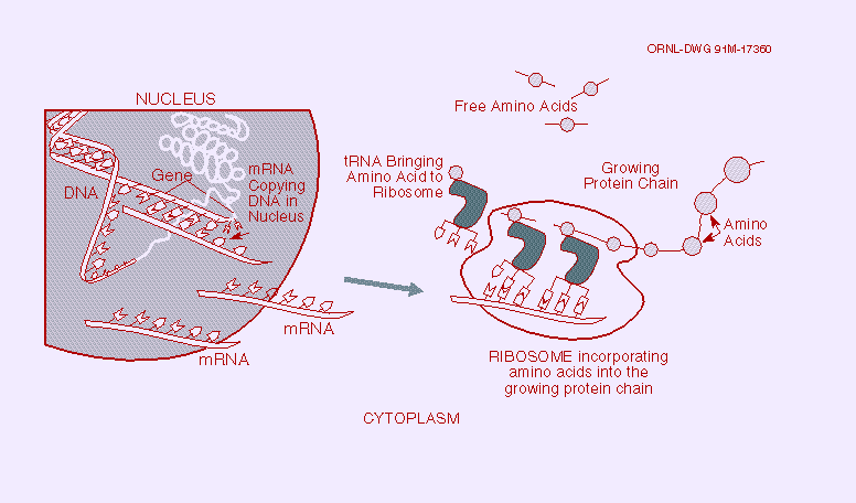 Fig. 5. Gene Expression.When genes are expressed, the genetic information (base sequence) on DNA is first transcribed (copied) to a molecule of messenger RNA in a process similar to DNA replication. The mRNA molecules then leave the cell nucleus and enter the cytoplasm, where triplets of bases (codons) forming the genetic code specify the particular amino acids that make up an individual protein. This process, called translation, is accomplished by ribosomes (cellular components composed of proteins and another class of RNA) that read the genetic code from the mRNA, and transfer RNAs (tRNAs) that transport amino acids to the ribosomes for attachment to the growing protein. (Source: see Fig. 4.)