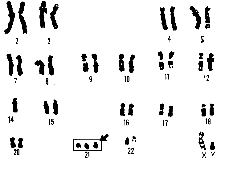 Fig. 6. Human Karyotype.Microscopic examination of chromosome size and banding patterns allows medical laboratories to identify and arrange each of the 24 different chromosomes (22 pairs of autosomes and one pair of sex chromosomes) into a karyotype, which then serves as a tool in the diagnosis of genetic diseases. The extra copy of chromosome 21 in this karyotype identifies this individual as having Down's syndrome.