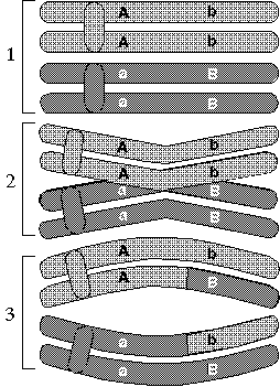 As chromosomes sort themselves out into the two separate haploid sets that form eggs or sperm, they occasionally exchange bits of DNA in a process called crossing over or recombination. Pieces of DNA are considered "linked" if they are so close that they are highly unlikely to be separated in this way. Crossing over is an extremely useful tool in the world of gene mapping for the simple fact that the chance that two genes will be separated in this way is related to how close they are together on the chromosome. Just as it's much more likely that lightning will strike today between you and the West Coast than it is that it will strike between you and your next-door neighbor, the odds of a split occurring between two proximate genes are meager compared to those of one occurring between genes on opposite ends of a chromosome. Thus, by observing the frequency with which two genes are inherited together, we can get a pretty good notion of how relatively close they are to each other on the chromosomes. Not only that, but by doing this for different pairs of genes, we can determine the precise order in which the genes appear as well.